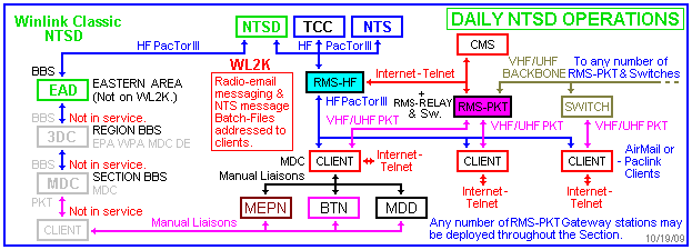 The global Winlink 2000 (WL2K) network is used by NTS/NTSD and ARES® for transporting radio-email formatted messaging including Batch-Files of NTS Radiograms. WL2K permits sending messages (with multiple addressees, copies, and binary attachments) to and from the public internet as well as to clients at [call sign]@winlink.org, or [Tactical Address]@winlink.org (for Paclink clients only). WL2K is a radio-email forwarding system, not a BBS system.