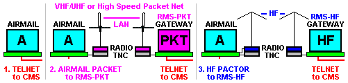 Any amateur operator in ARES® or NTS/NTSD can access the system as an email client using free AirMail software with a modest computer (Windows95™ or better). AirMail may be downloaded from the amateur page at http://www.airmail2000.com, installed in a few minutes (see instructions below), and used to exchange email via the web connection of an ISP (the email application and Telnet/Internet driver are built into AirMail). With the addition of a basic packet KISS TNC and a VHF/UHF radio, and/or a PacTor modem and HF radio, the operator can bridge across the “last mile” where the telephone service and internet are down. This is a very modest equipment list allowing ARES® teams to deploy the technology at minimal cost, particularly in VHF/UHF local environments - perhaps no cost for existing packet stations.