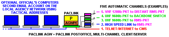 Fig. 4 The Paclink module allows officials to connect to the system through the Paclink station as remote clients using the email applications on their own computers (using an additional email account each with a unique Tactical Address). The Paclink module, in other words, provides an smtp/POP3 server for the associated email applications, and a connection side to manage the internet and radio connections. Paclink automatically tries the assigned connection channels in order to find a functioning route.