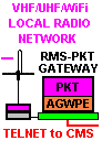 The RMS-Packet module (XP/Vista & Dot Net 2+, replacing the older Telpac software for W98™+) provides a packet radio link between client VHF/UHF/WiFi/DD stations and a telnet/internet connection to the CMSs or an RMS-Relay module. An RMS-Packet Gateway may be co-located at a client station or at a separate secured site, in order to provide AirMail and Paclink clients with access to the WL2K CMSs. RMS-Packet also works with AGWPE (multiple TNC driver utility) to provide multiple radio channel connections. |
