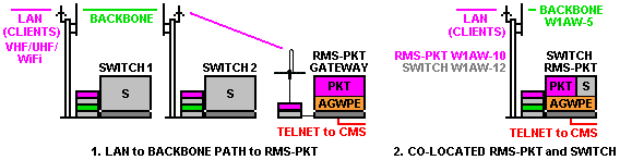 Fig. 8 · 1) The LAN clients reach WL2K via a local switch to a backbone then a second switch to the RMS-Packet Gateway. The RMS-Packet Gateway might also have been co-located at the Switch 2 location, thus freeing up a radio and TNC for another leg of the backbone. · 2) In a co-located RMS-Packet Gateway and Switch, if the RMS-Packet Gateway (w1aw-10) at the site loses its internet service, the client stations on the LAN can connect to the Switch (w1aw-12) using the separate call sign dash number (ssid). The Switch will then relay the client’s packets over the backbone (w1aw-5) to a functioning RMS-Packet Gateway elsewhere. The same method may be used for an RMS-Packet Gateway and Switch co-located at a client station. AGWPE permits defining multiple connections along the way, including expected response scripts, to reach through many nodes of the backbone. · 3) The RMS-Relay Server Module may also be installed at an RMS-Packet location in order to provide a server for automatic email service if internet service is lost.