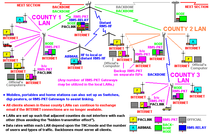 The link to other counties may be extended using FPAC or Rose Node switches, or even digi-peaters (with reduced speed). County-to-county links may be on bands not used by the local area networks to avoid mutual interference. A single remote jurisdiction may operate as shown for one of the counties above, eliminating the county links and Node equipment, and using the RMS-Packet, RMS-Relay and HF link for handling traffic internally and with other areas. The RMS-Relay, RMS-Packet and Node equipment may share a single computer with a client software package and link to official’s computers. Such stations installed at hardened sites such as EOCs can provide the LAN services, or can be located elsewhere with high speed linking to the EOC. In addition, AirMail clients with packet or HF PacTor can be used to forward radio-email messaging from one to the other, thus permitting relays outside of the “last mile” to stations which can “re-file” the messages onto WL2K or the internet. |