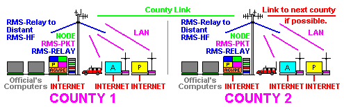 Two counties in a remote part of a Section can provide automatic radio-email service for all their LAN clients with or without internet service. When possible, a radio link between them can provide for LAN clients in one county to use the RMS-Packet Gateway in the other if the internet is available there. If both counties lose infrastructure, automatic radio-email between local clients is sustained by each RMS-Relay. Either or both may evoke an HF connection through their RMS-Relay servers to a WL2K RMS-HF Gateway anywhere in the country in order to reach addressees on the WL2K system or public internet, including other jurisdictions anywhere in the Section.