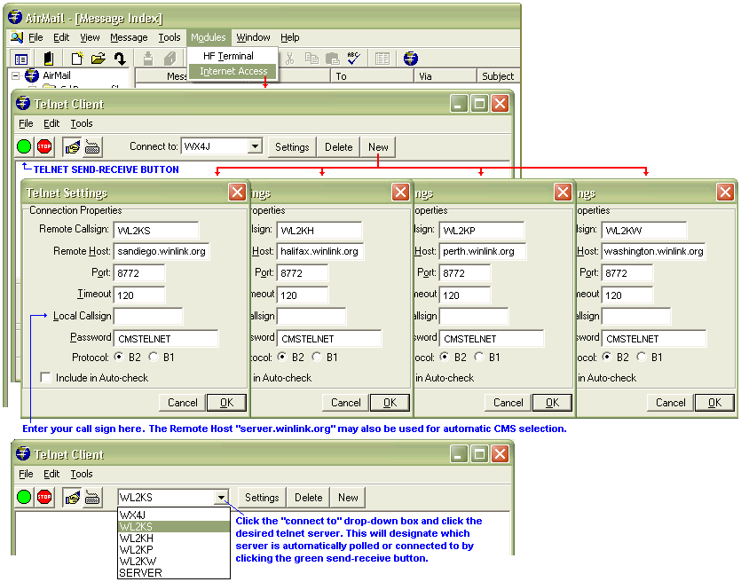 5. Launch AirMail. If a first time run wizard pops up enter the default information for your call, etc., and a telnet connection per the slide regarding telnet settings (below). Telnet settings may be checked or changed later at any time from within the telnet/internet module (click Modules on the main menu, select internet access). Telnet settings must be installed, and your computer must have a connection to the internet, before using AirMail to send or receive radio-email. See the telnet settings section below.