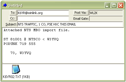 ARRL radiograms in the standard format may be entered in plain text into the body text of radio-email, or in attached text files, when sending such radio-email to other ARES® or NTS stations. This Batch File format is intended to be used when sending one or more radiograms to a Target NTSD MBO station. The Batch File format permits the NTSD MBO operator to import the Batch File directly into the MBO software without using copy and paste methods.