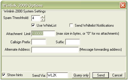 Fill in the Attachment limit in bytes, no commas. (Select size based upon your mode of connection keeping in mind the transfer rate and connect time required.) Clicking Query only will simply ask the system to report back your current settings. (Checking the Show hints box will enable help information as you move the mouse over each window. See Options Message in the AirMail help file for more information.) Check that the Send Via box shows WL2K.