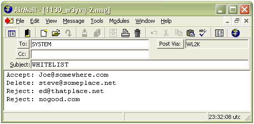 ACCEPT: jblow@somewhere.com - will allow messages from jblow@somewhere.com to be accepted. You may send multiple lines, each containing one e-mail address.